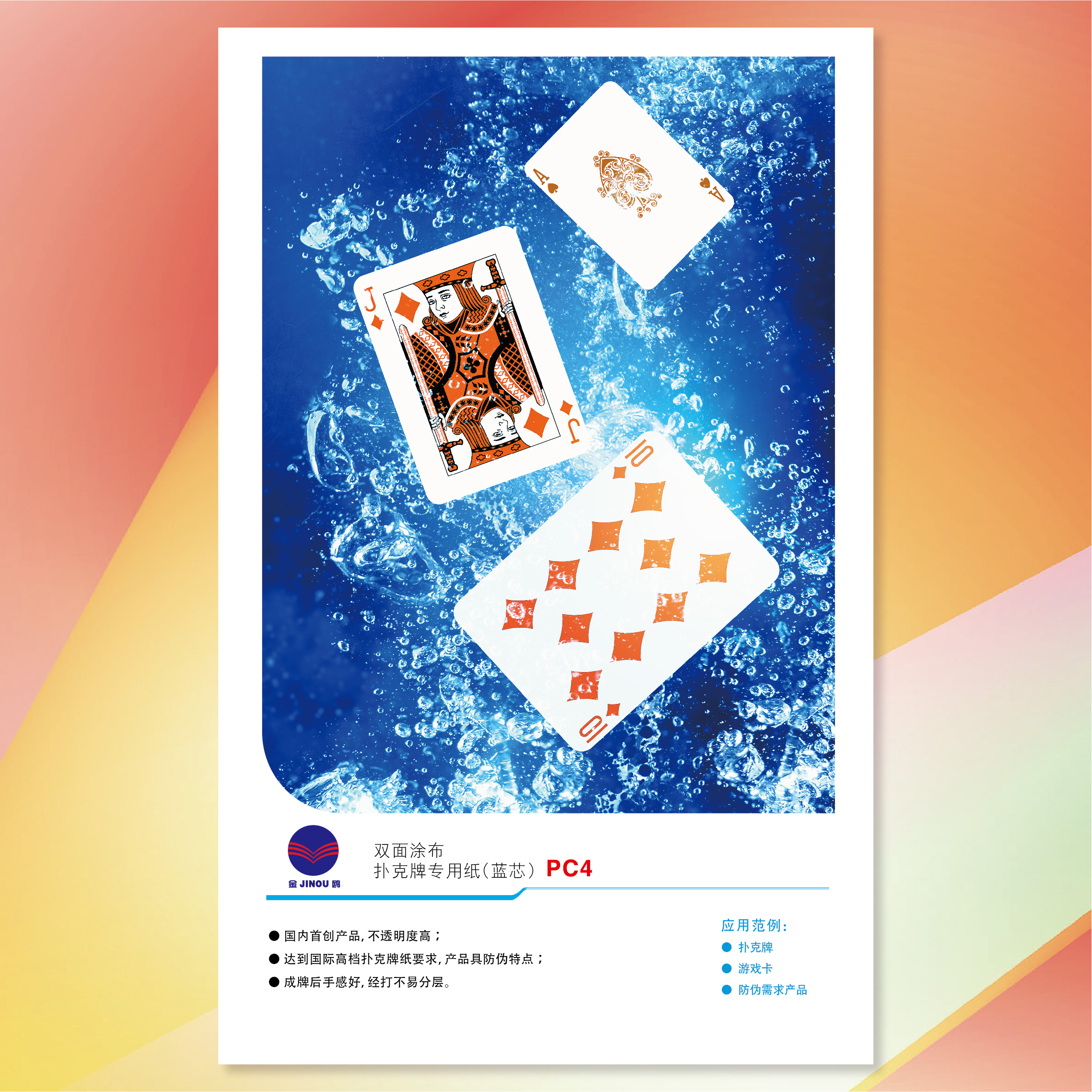 2、達(dá)到國(guó)際高檔撲克牌紙要求,產(chǎn)品具防偽特點(diǎn)。